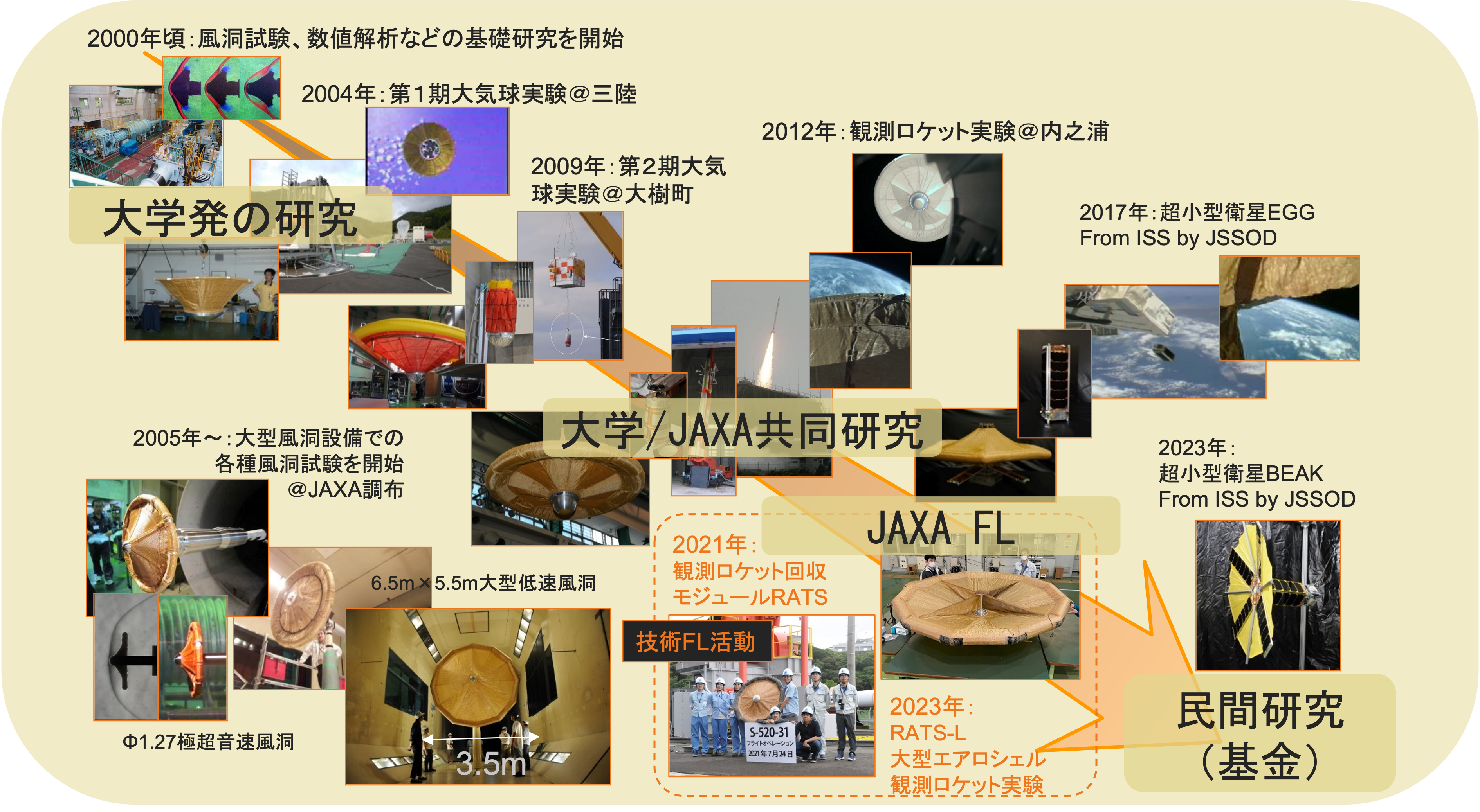 私たちは2000年頃から展開型エアロシェルの基礎研究を風洞実験や数値シミュレーションで独自に開始しました。その後、成層圏気球を用いた落下飛行試験を2回、観測ロケットによる再突入実験を3回、超小型衛星による軌道上実証を2回を行ってきました。このように、展開型エアロシェルの技術はフライト実験によって成熟してきました。 次のステップは、地球低軌道からの大気圏再突入実証(FEATHER)です。それが成功すれば実際のミッションに応用可能であることが示され、低コストな超小型火星着陸機(FANG)の実現に大きく近づくことになります。